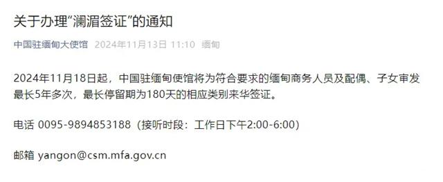 2024年11月18日起,中國駐緬甸使館將為符合要求的緬甸商務(wù)人員及配偶、子女審發(fā)最長5年多次,最長停留期為180天的相應(yīng)類別來華簽證。