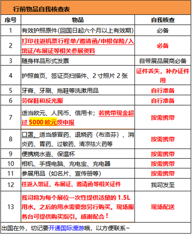 ② 打印版:往返機(jī)票行程單、申根保險(xiǎn)、入館證 / 布展證(丟失需補(bǔ)購(gòu)€53 / 人)、邀請(qǐng)函、隨身樣品形式發(fā)票(帶樣品展商必備)