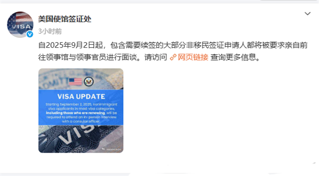 美國使館簽證處今日剛發通告:自2025年9月2日起,包含需要續簽的大部分非移民簽證申請人都將被要求親自前往領事館與領事官員進行面談。